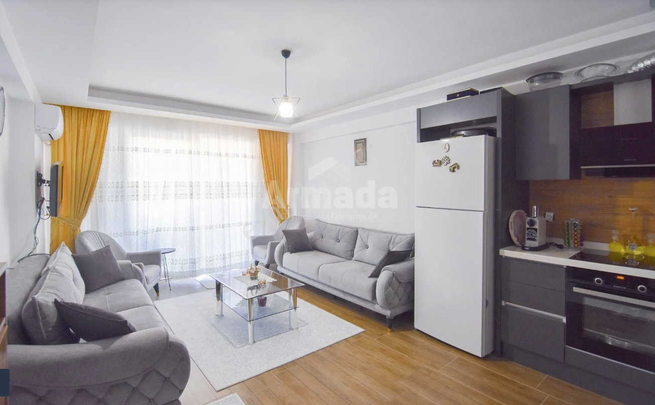 65 sq m gross, 4th floor, 1+1 with nature view, one bedroom, living room, kitchen, bathroom, 4th floor, elevator, built-in wardrobes, bed and shoe cabinets, wardrobe newly made by a carpenter. Price 2,860,000 TL